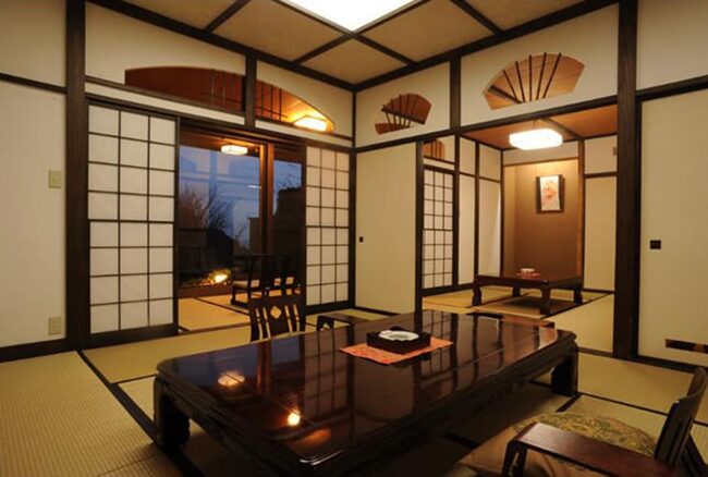 The traditional Japanese interiors—tatami flooring, futon bedding, and artful details such as ranma and fusuma—are gently complemented by modern comforts.