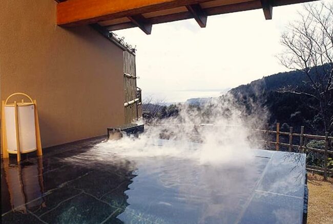 Each room offers a private open-air hot spring bath using natural hot spring water from the Inatori Onsen source.
